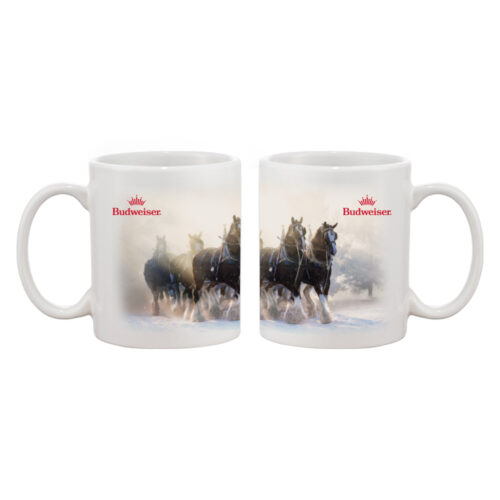 Budweiser Clydesdale 11oz Ceramic Coffee Mug Features a Cream Colored Mug with a Budweiser Clydesdale Scene thru-out the Mug . Hand wash only