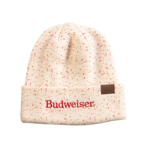 Budweiser Cream Beanie Features a Cream and red speckle Beanie Acrylic knit. Embroidered and leather loop logos, made of 100% acrylic. hand wash only.