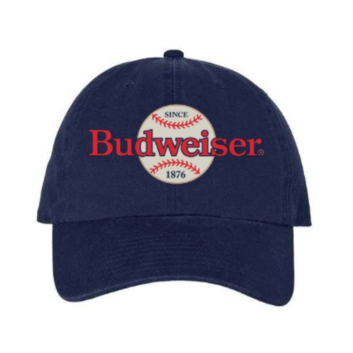 Budweiser Navy Blue Baseball Cap Features the Budweiser logo in red with a baseball in center of the hat. one size fits most with an adjustable strap. machine wash cold with like colors.