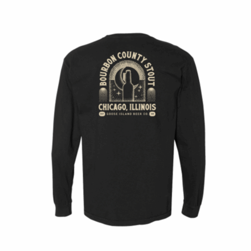 Goose Island Bourbon County Stout Long Sleeve T-shirt Features a Black Long Sleeve T-shirt made of 100% Cotton Has the Goose Island Bourbon County Stout Logo on the Front and the back has has the Chicago Illinois .